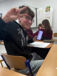 Nejdůležitější zpráva! Náš starý žák má nový telefonní zařízení, dostal ho za to, že podal přihlášku a je velice šťastný. (FL, MK)