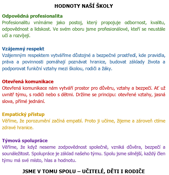 · Jsme školou, která své žáky o důležitých hodnotách nejen učí, ale skutečně tyto hodnoty společně je žijeme. To je to, čemu věříme. Proto jsme vstoupili do sítě škol podporující hodnotové vzdělávání.